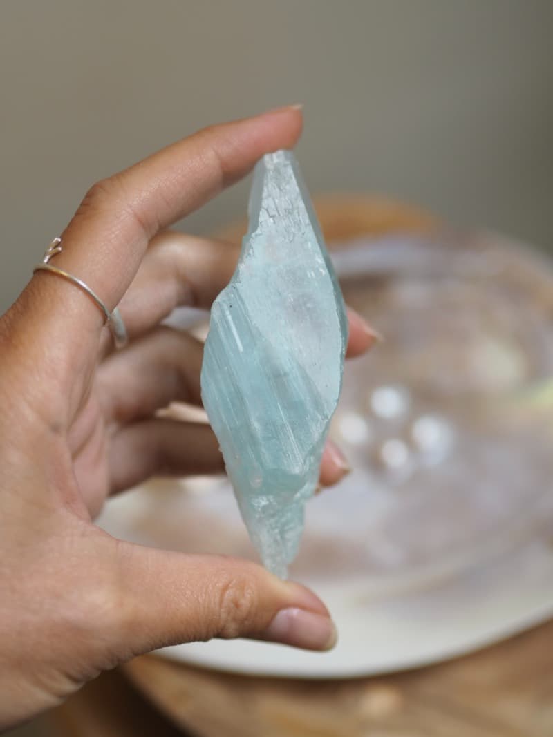 Jeho blankytně modrá barva navozuje klid mysli, zahání stres a strach. Akvamarín symbolizuje odvahu. V duchovní rovině zbystřuje intuici a otevírá cestu jasnozřivosti. Akvamarín vytváří ochranný štít pro auru a uvádí do rovnováhy čakry. Jeho očistná zář vnáší do naší mysli pocit spokojenosti, zmirňuje podrážděnost a agresivitu.