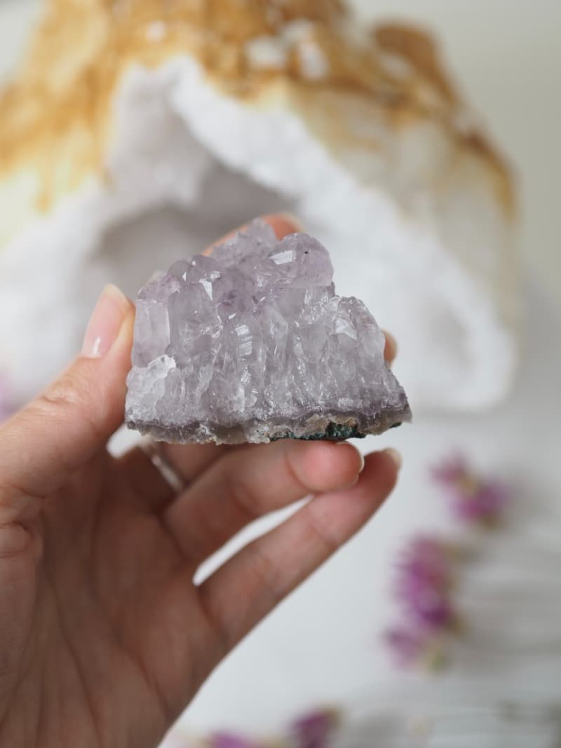Ametyst okouzlí mystickou fialovou barvu, která vdechne místu čarovnou atmosféru. Velký kámen prostor ozdobí svým unikátním výrazem, který působí jako fantastický palácový šperk. Kromě toho poskytuje mimořádnou ochranu. Povznáší ducha, vede k harmonickému vnímání vnitřních světů a rozvíjí intuici. Je to mimořádně mocný kámen s vysokými vibracemi, silnou léčivou a očistnou mocí, zahání noční můry, podpoří klidný spánek a navodí příjemné uzdravující sny.