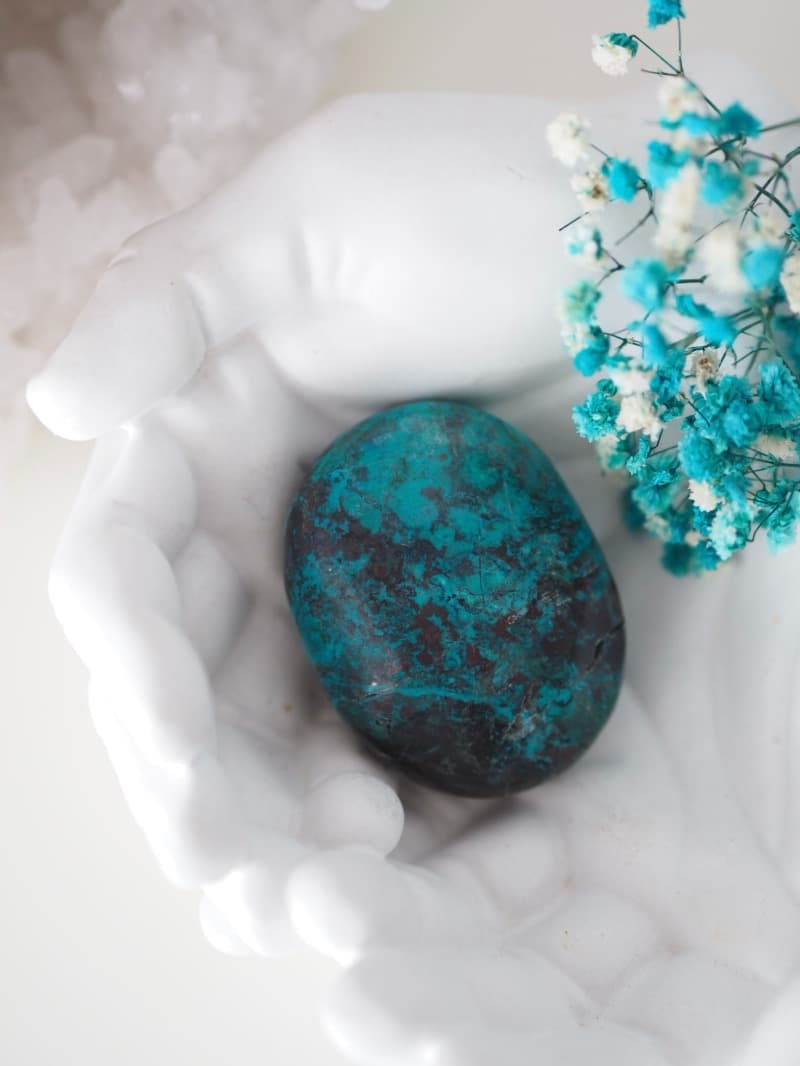 Chryzokol je znám svými harmonizačními účinky, podporuje emoční rovnováhu a vnitřní klid. Je skvělým pomocníkem v oblasti komunikace a sebeprezentace, zmírňuje stres a úzkost, podporuje pocity klidu a napojení na sebe a svou vnitřní pravdu. Odstraňuje ze života těžkosti a složitosti a chrání před negativními energiemi.