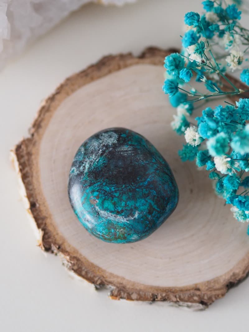 Chryzokol je znám svými harmonizačními účinky, podporuje emoční rovnováhu a vnitřní klid. Je skvělým pomocníkem v oblasti komunikace a sebeprezentace, zmírňuje stres a úzkost, podporuje pocity klidu a napojení na sebe a svou vnitřní pravdu. Odstraňuje ze života těžkosti a složitosti a chrání před negativními energiemi.