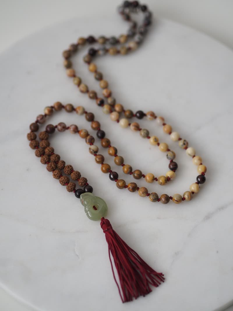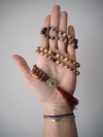 Korálky na male: Bláznivý Achát, Býčí oko, Jadeit, Rudrakša.
