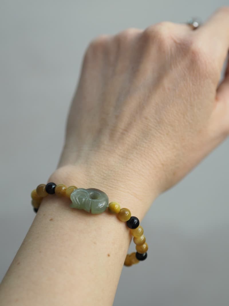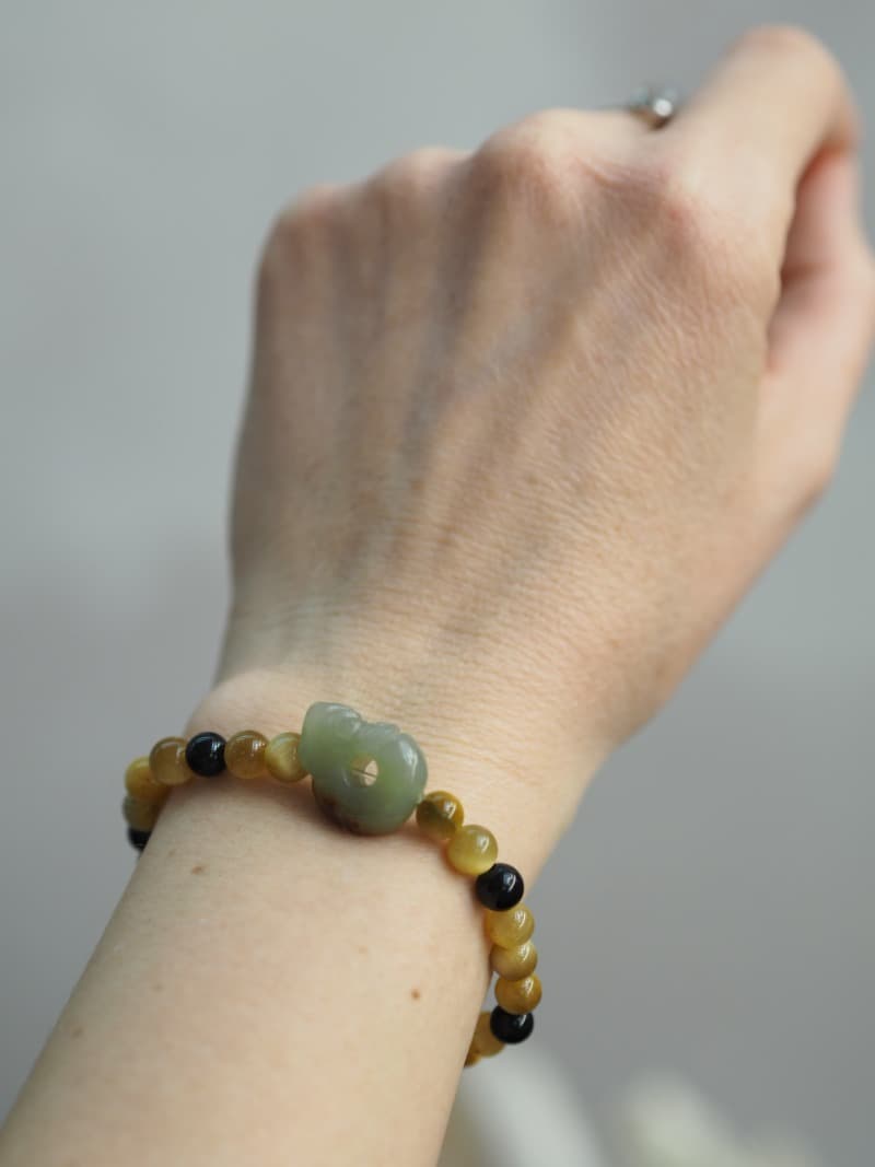 Korálky na náramku: Zlatý Obsidián, Tygří Oko, Onyx.