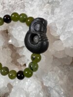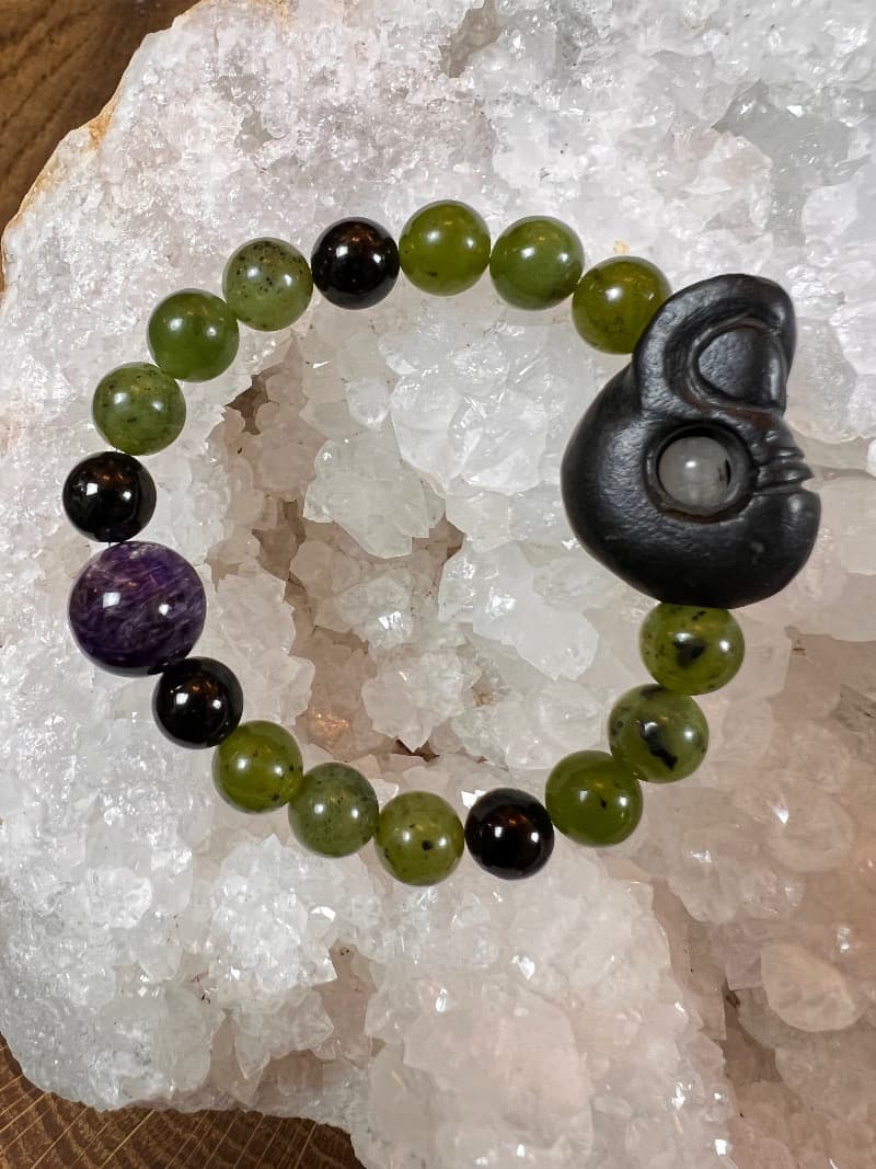 Korálky na náramku: Kanadský Nefrit Zelený, Černý Jadeit, Čaroit, Křišťál, Nefrit.