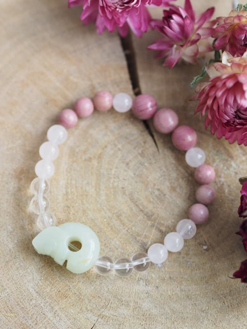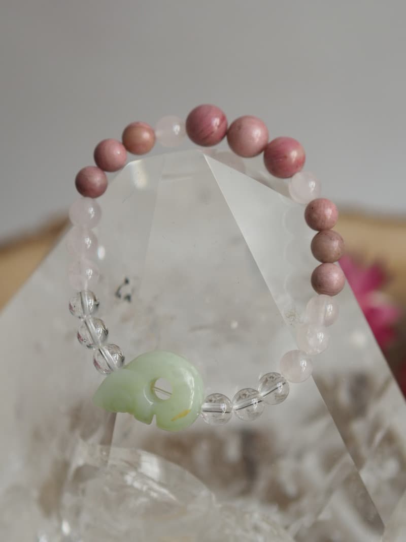 Korálky na náramku: Rodonit, Růženín, Křišťál.