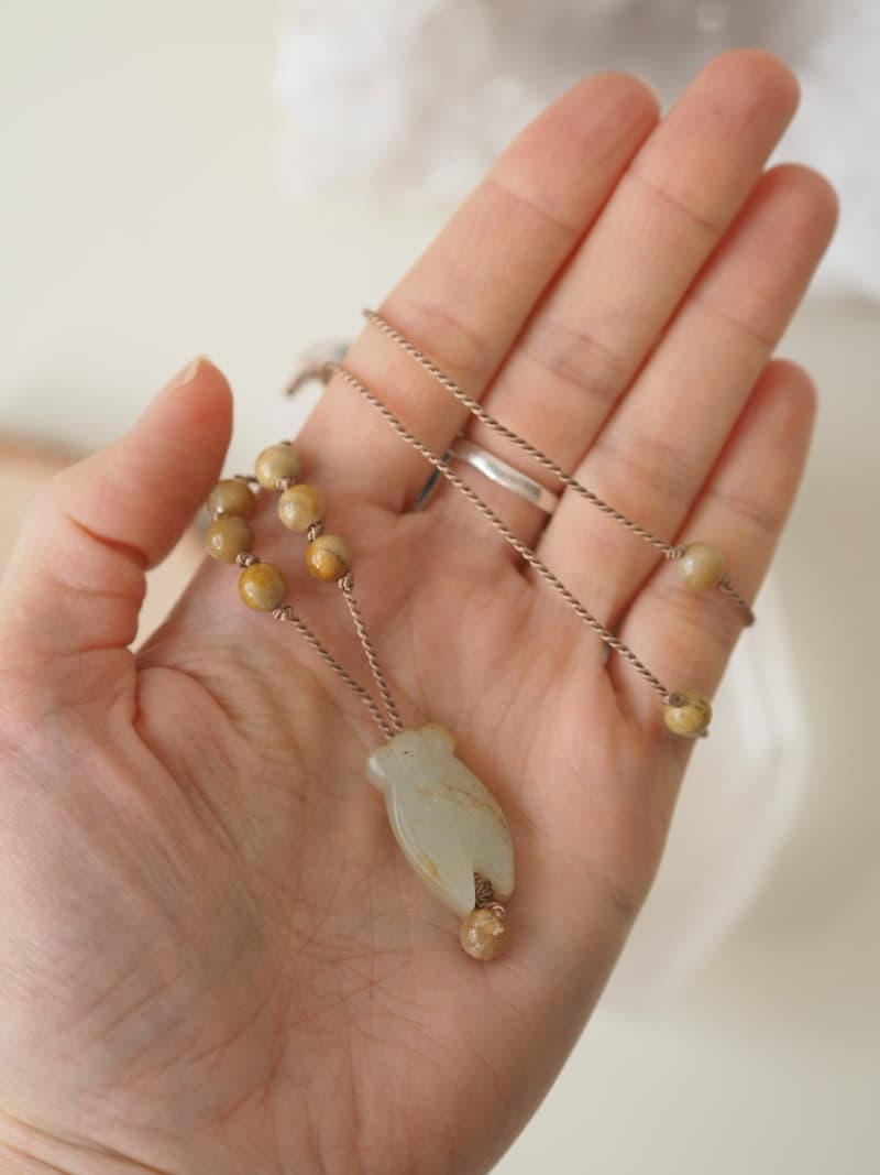 Jadeitová Cikáda ve stylu neolitické Číny Vás lépe dovede do vyšších sfér, protože je to její domovina a může Vám být neskonale nápomocna na Vaší duchovní Cestě. Jadeit je kamenem klidu, zahání stres a negativní emoce, tiší strachy, vztek, obavy a zlobu, zahání pocit viny. Uklidňuje mysl, podporuje něhu, ženskost, jemnost, je kamenem pravé, ryzí, lásky. Přispívá ke zdravým močovým cestám.
