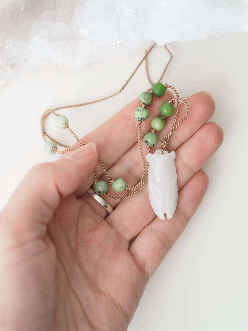 Náhrdelník s jadeitovou Cikádou podporující Život. Propojuje nás se zdroji, s moudrostí a přináší harmonii.