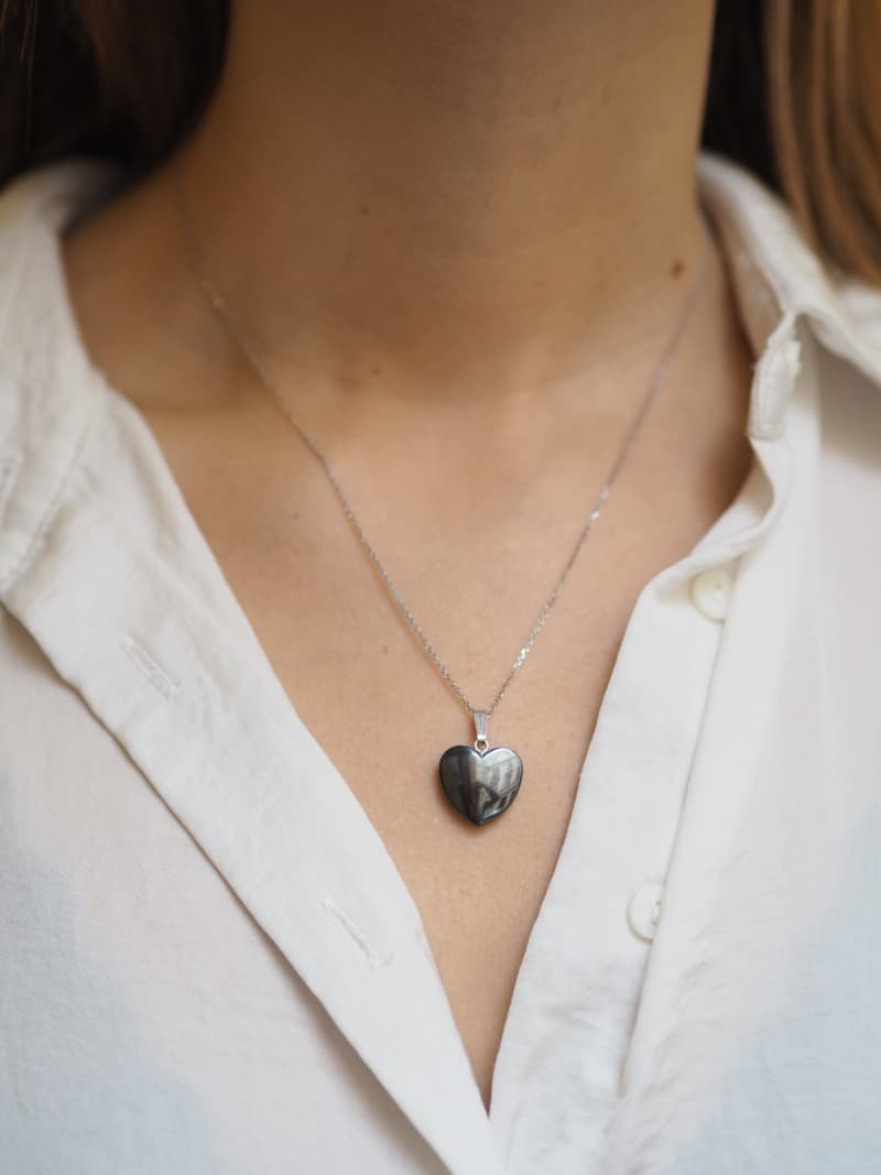 Stříbrný přívěsek s Hematitem ve tvaru srdce. Hematit uzemňuje, ochraňuje, uvádí do rovnováhy tělo, mysl i ducha. Přináší do života klid, mír a harmonii. Zvyšuje sebevědomí. Přispívá k soustředění a zlepšuje paměť.