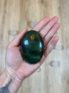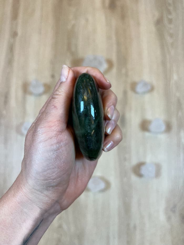 Jako kámen snů, položen na čele, přináší sny nahlížející do hloubky našeho nitra. Zelený Nefrit blahodárně působí na nervový systém, harmonizuje nefungující vztahy, pomáhá realizovat touhy a vášně, má nejblíže k centru srdce.