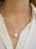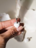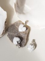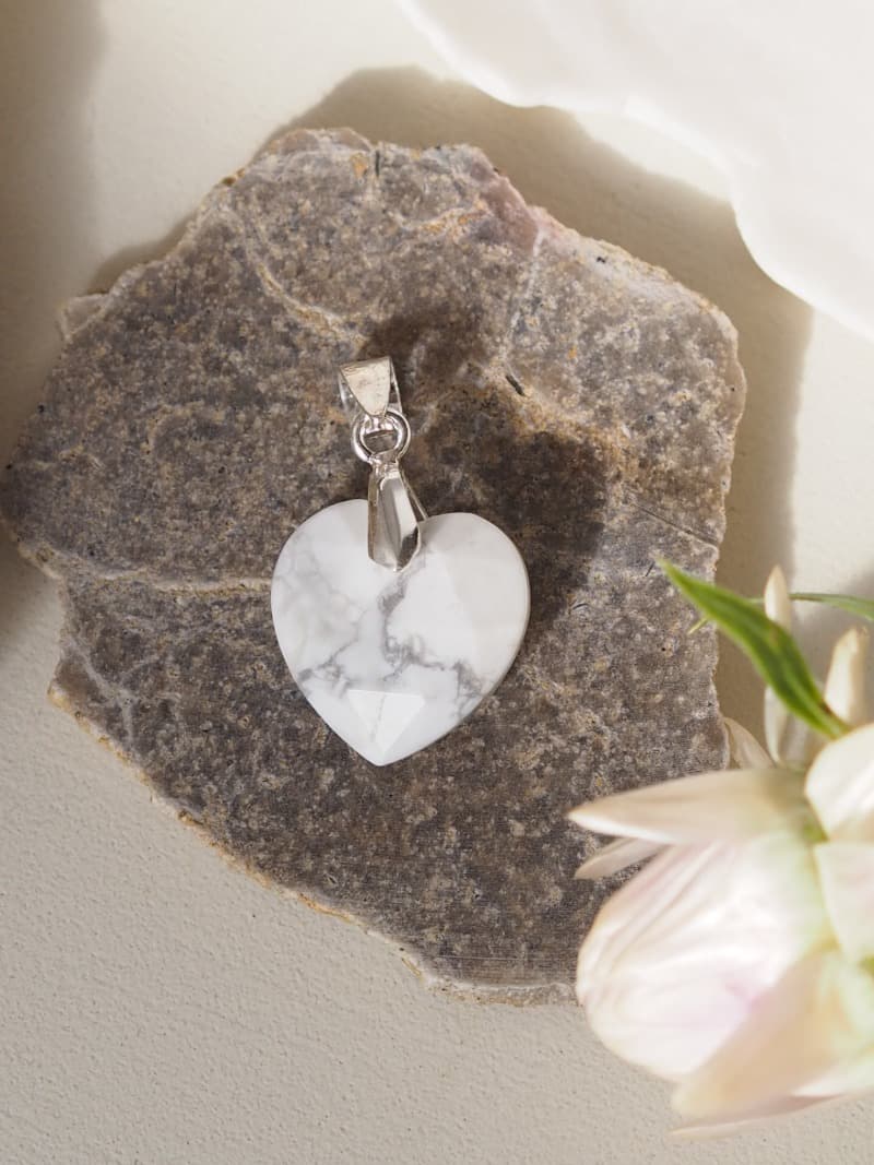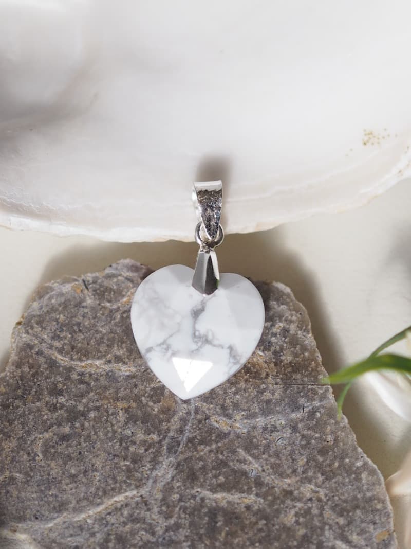 Stříbrný přívěsek z broušeného Howlitu (Magnezit) ve tvaru srdce. Howlit je nositelem hlubokého klidu a emoční vyrovnanosti, je tedy vhodný pro ty, jež snadno podléhají stresu a napětí. Podporuje sebepřijetí, trpělivost a upřímnost. Vliv má také na zdraví kostí a zubů, díky tomu, že přispívá k ukládání vápníku v těle.