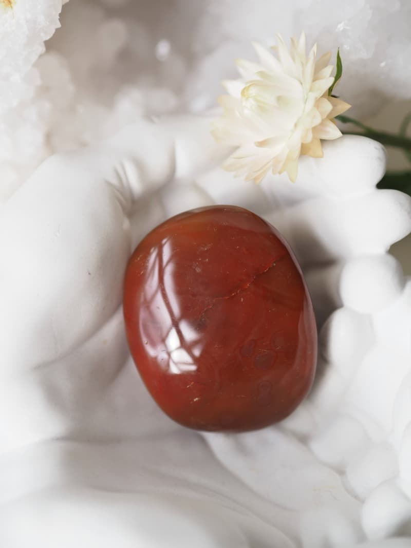 Karneol zvyšuje motivaci a dodává sebedůvěru. Pomáhá podnikat reálné kroky k vytyčenému cíli jedincům, kteří se nemohou pohnout z místa, jsou uvězněni v nečinnosti, lenosti a neví si rady kam směřují. Podporuje v nás kreativitu, uplatnění v životě, přitahuje nové zkušenosti a aktivní žití.