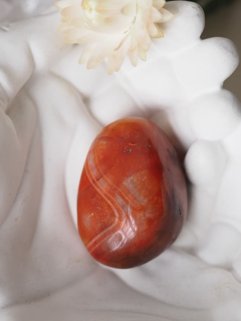 Karneol zvyšuje motivaci a dodává sebedůvěru. Pomáhá podnikat reálné kroky k vytyčenému cíli jedincům, kteří se nemohou pohnout z místa, jsou uvězněni v nečinnosti, lenosti a neví si rady kam směřují. Podporuje v nás kreativitu, uplatnění v životě, přitahuje nové zkušenosti a aktivní žití.