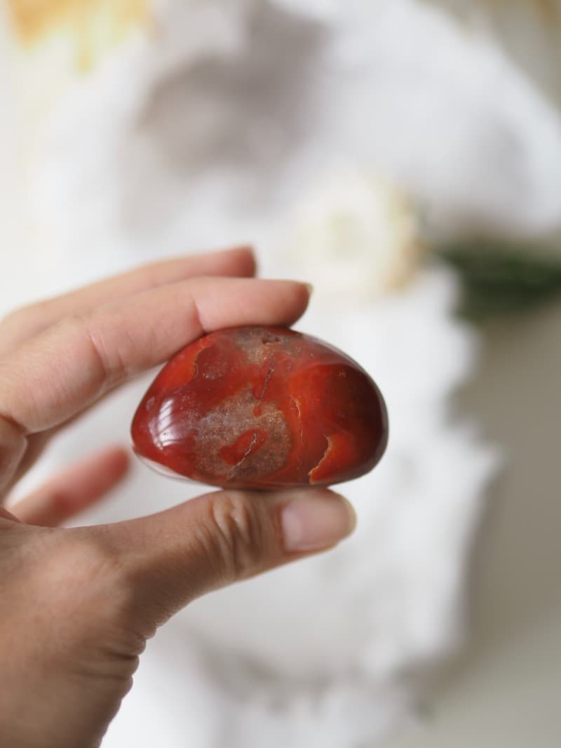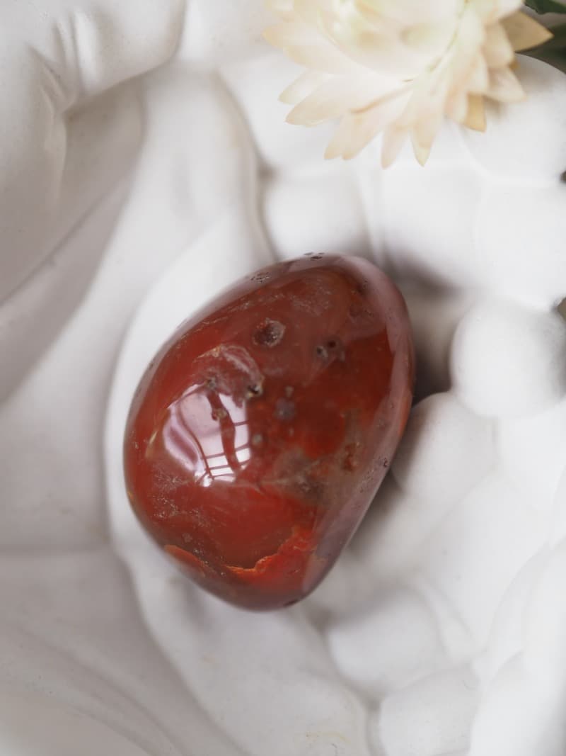 Karneol zvyšuje motivaci a dodává sebedůvěru. Pomáhá podnikat reálné kroky k vytyčenému cíli jedincům, kteří se nemohou pohnout z místa, jsou uvězněni v nečinnosti, lenosti a neví si rady kam směřují. Podporuje v nás kreativitu, uplatnění v životě, přitahuje nové zkušenosti a aktivní žití.