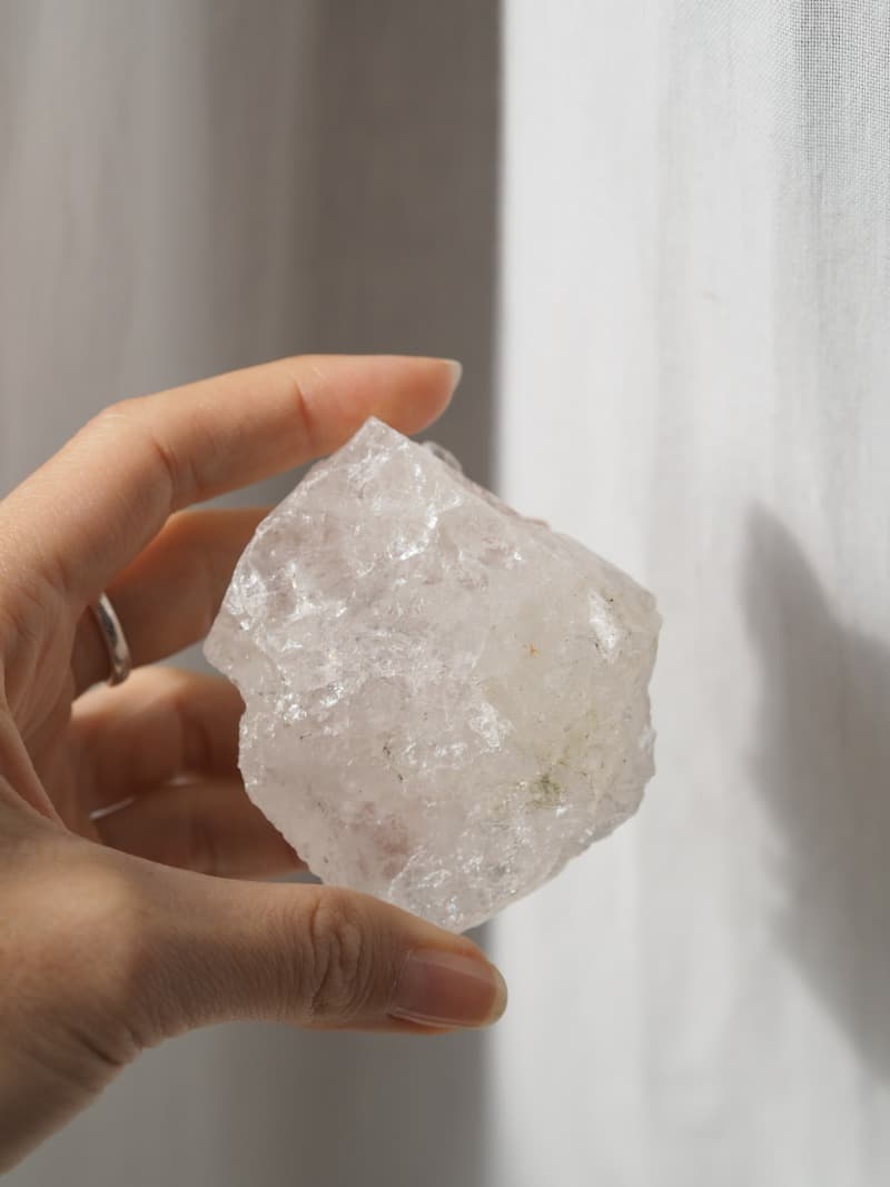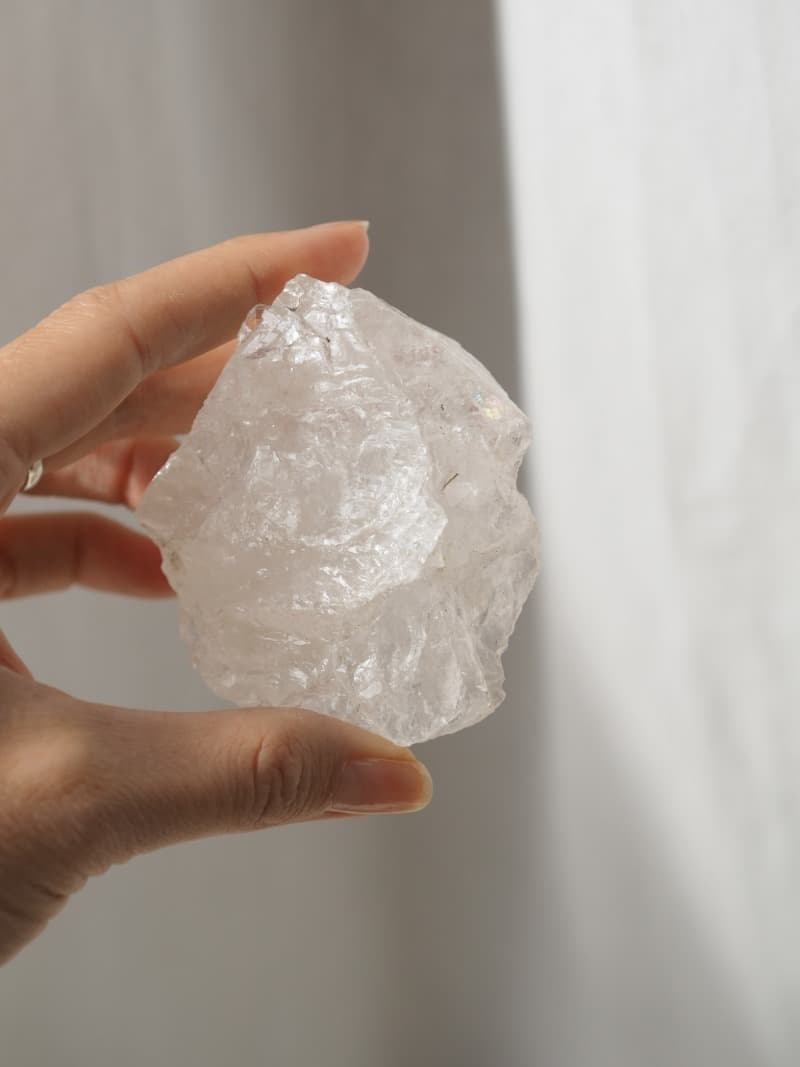 Křišťál ve své surové formě s mléčným zbarvením a nepravidelnými tvary evokuje nebeské sféry. Je čistý a světlem naplněný, ale zároveň se ve své divokosti hodí k nám, na Zemi. Spojuje v sobě kvalitu nebeskou i zemskou.