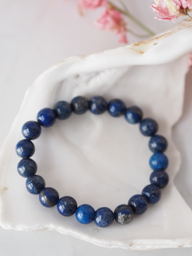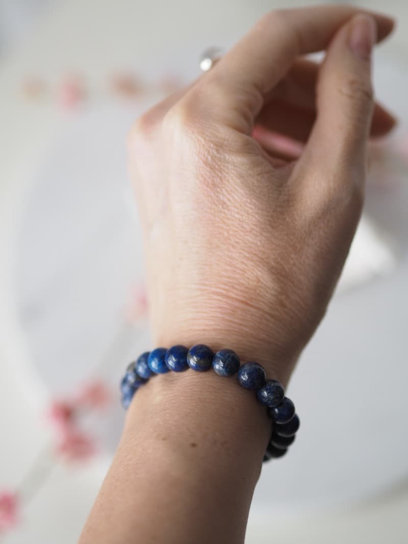Lapis Lazuli vnáší do života hloubku ducha. Je kamenem moudrosti a čisté lásky. Pomáhá plně přijmout sám sebe. Rozvíjí intuici a otvírá třetí oko. Posiluje důvěru, dodává pocit klidu a bezpečí. Učí nás naslouchat druhým a komunikovat s lehkostí. Harmonizuje mezilidské vztahy. Dokáže odbourat stres a navodit pocit naprostého klidu a míru. Šťastnému majiteli navozuje stav harmonie – tělesnou, duševní, citovou a duchovní rovinu. Otevírá třetí oko. Umožňuje navázat kontakt s duchovními průvodci. Usnadňuje vyjádření vlastního názoru. Probouzí lásku. Dává pochopit nekonečnost vesmíru a probouzí citlivost a vnímavost k poselství vzdálených světů. Síla tohoto kamene je především v duchovní oblasti, pomáhá při telepatii a meditaci. Průměr kuličky cca 8 mm. Obvod náramku cca 17 cm.