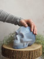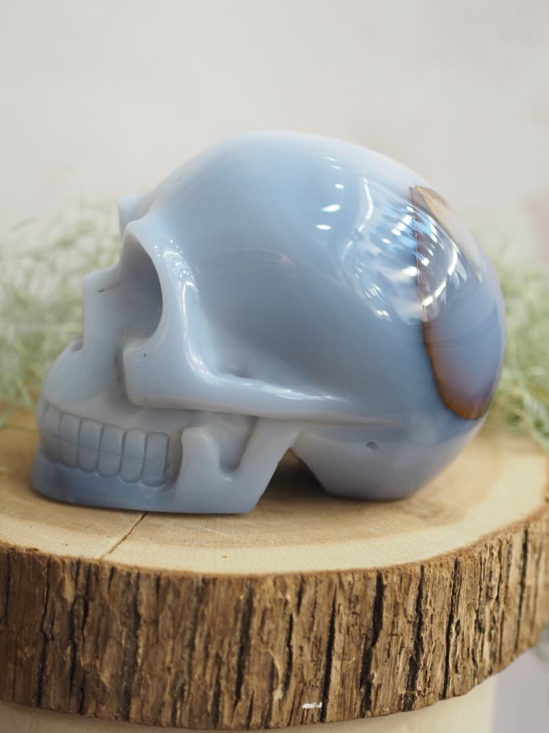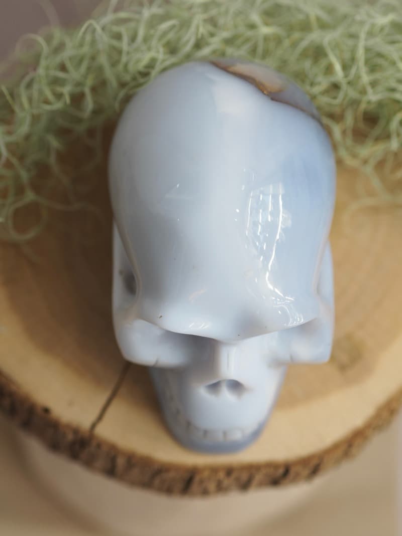 Lebka z Chalcedonu, kamene s klidnou energií. Chalcedon pomáhá léčit neprojevené emoce. Lebka je symbolem znovuzrození a přechodu do vyšších sfér.