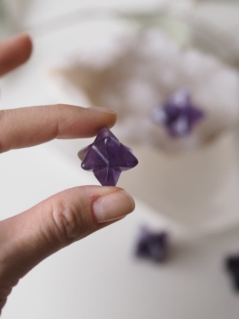 Merkaba z Ametystu. Merkaba je jedním ze symbolů posvátné geometrie, jež je vnímán jako energetické pole či vozidlo pro duchovní transformaci a vzestup. Přináší ochranu, rovnováhu a spojení s vyšším Já.