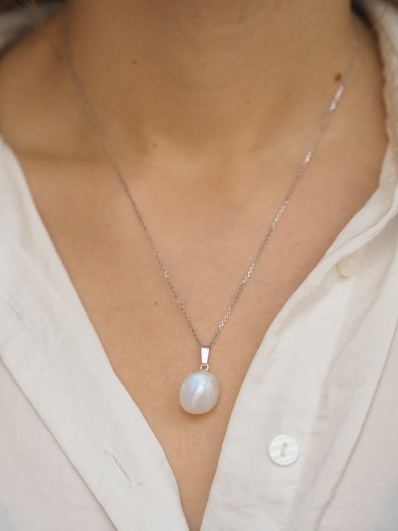 Stříbrný přívěsek s tromlovaným Měsíčním kamenem. Měsíční kámen je především kamenem žen, jejich ochráncem a léčitelem. Je ctěn jako symbol lásky, citu a vnitřní harmonie. Povzbuzuje jemnost a něžnost. Vnáší do života klid, porozumění, přizpůsobivost, jemnou pohyblivost, snahu po rozumných řešení. Zbystřuje intuici a usnadňuje komunikaci.