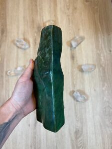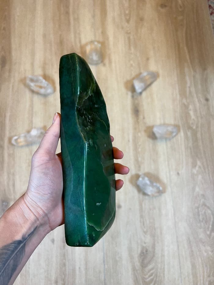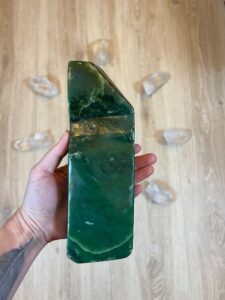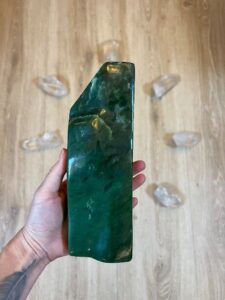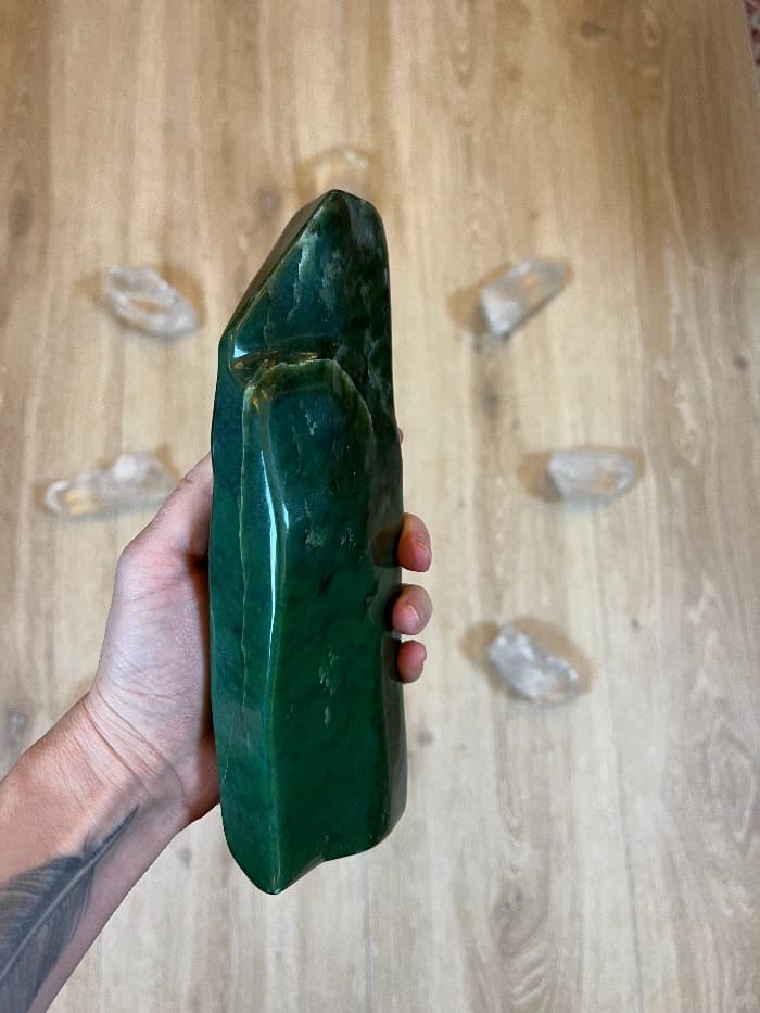 Jako kámen snů, položen na čele, přináší sny nahlížející do hloubky našeho nitra. Zelený Nefrit blahodárně působí na nervový systém, harmonizuje nefungující vztahy, pomáhá realizovat touhy a vášně, má nejblíže k centru srdce.