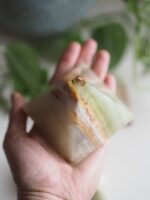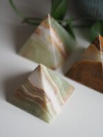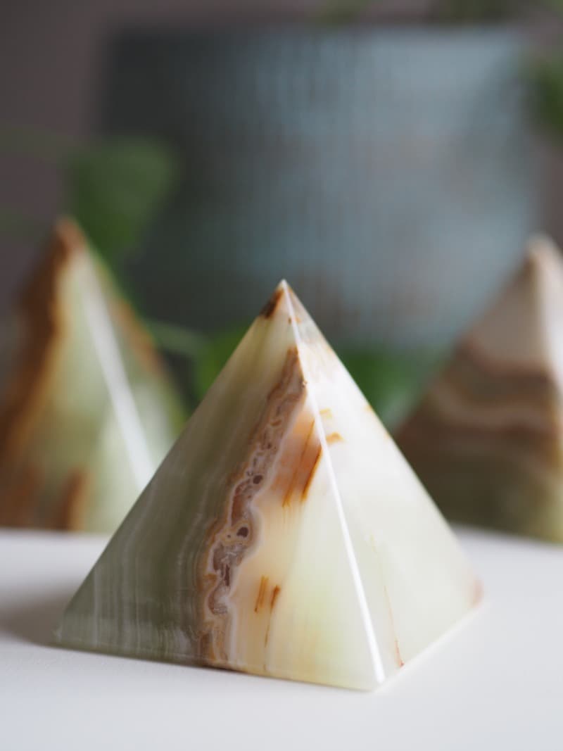 Pyramida z Onyxu. Onyx je silný ochranný kámen, který se používá pro dodání sebevědomí, síly, vytrvalosti a posílení logického myšlení. Je vhodný pro období stresu, uzemňuje a pomáhá zpracovat staré křivdy.