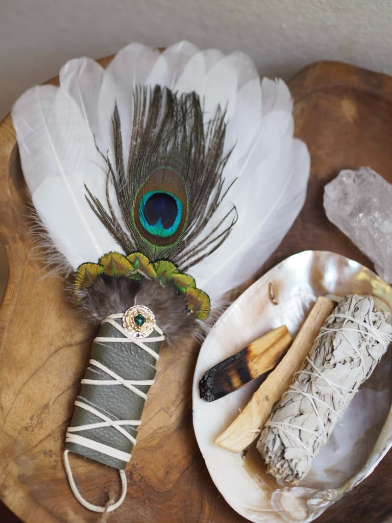 Ručně vyrobený peříčkový vějíř slouží k rozhánění dýmu při vykuřování bylinami a jinými vykuřovadly. Při vykuřování je Vaší prodlouženou rukou a použité materiály svou energií podporují Váš záměr, který do vykuřování vkládáte.