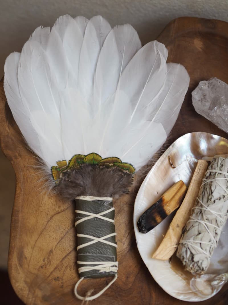 Peříčka jsou lepená včelím voskem. S vějířem je třeba zacházet jemně a uchovávat ho při převážení v pevné krabičce, aby se peří příliš nepoškodilo. Věřím, že vějíř bude milým společníkem při Vašich rituálech.