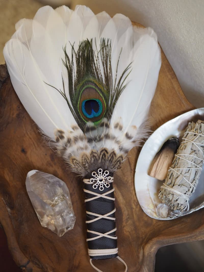 Peříčka jsou lepená včelím voskem. S vějířem je třeba zacházet jemně a uchovávat ho při převážení v pevné krabičce, aby se peří příliš nepoškodilo. Věřím, že vějíř bude milým společníkem při Vašich rituálech.