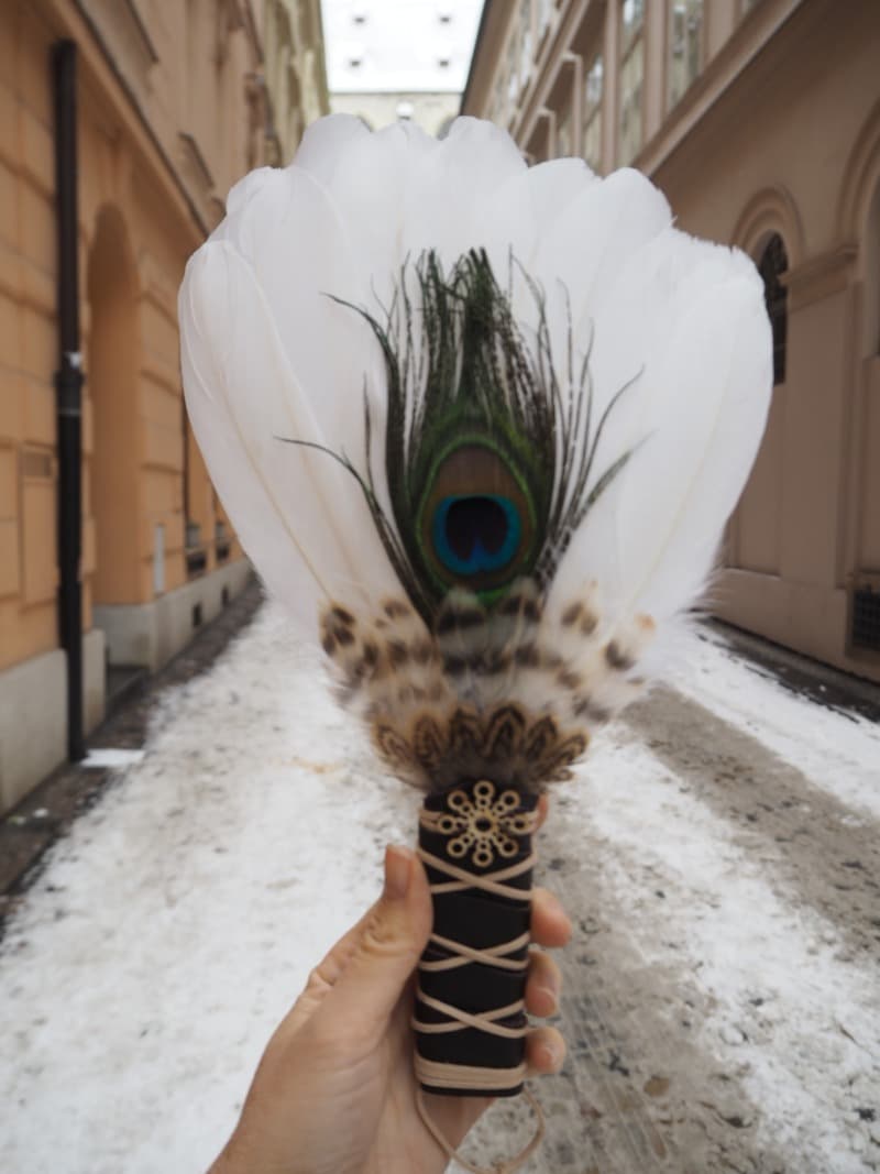 Ručně vyrobený peříčkový vějíř slouží k rozhánění dýmu při vykuřování bylinami a jinými vykuřovadly. Při vykuřování je Vaší prodlouženou rukou a použité materiály svou energií podporují Váš záměr, který do vykuřování vkládáte.