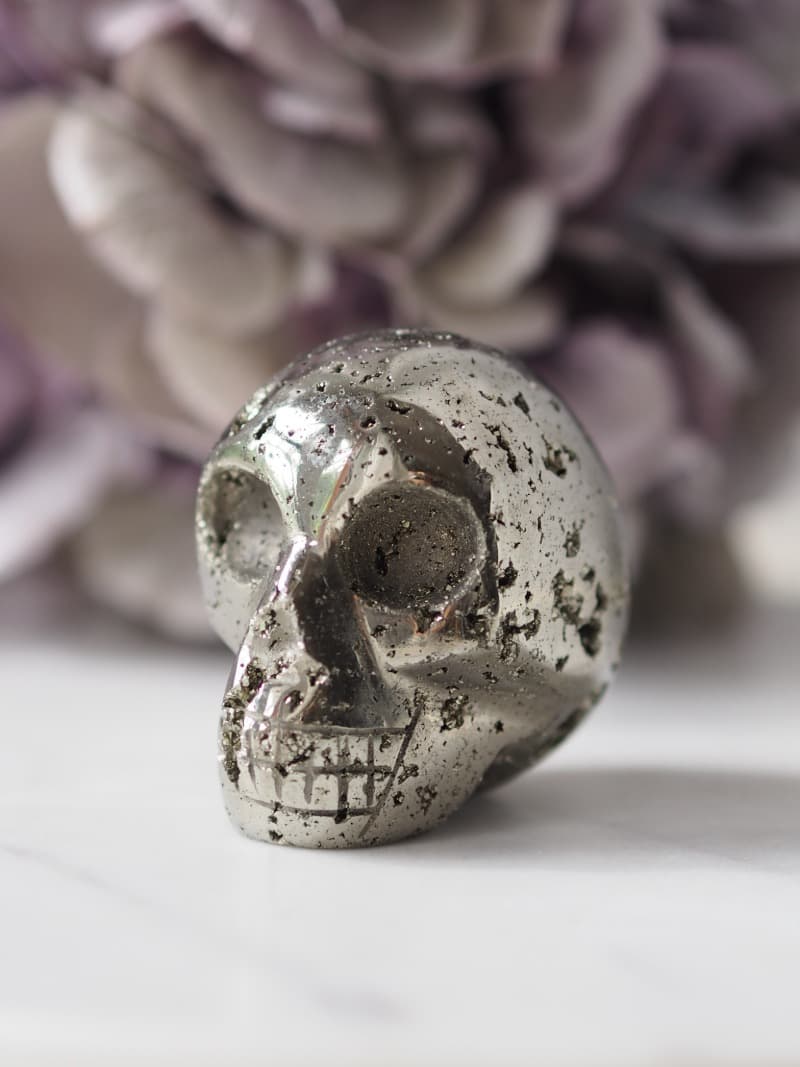 Lebka – symbol pozemského života, hmoty, znovuzrození a přechodu do vyšších sfér z Pyritu. Pyrit je kamenem světla, hojnosti a pozitivní energie. Dodává energii a přitahuje do života hojnost v mnoha oblastech života – zdraví, lásky, práce, financí, vztahů. Povzbuzuje kreativitu a příliv nových nápadů. Podporuje akční energií a vůli konat.