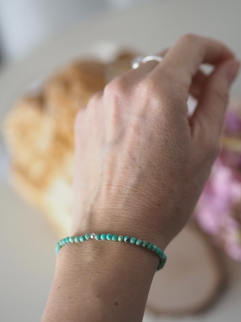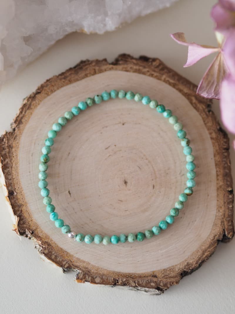Jemný náramek z drobných broušených kuliček Tyrkysu svoji majitelku nejen rozzáří, ale také podpoří její dobrou náladu a mluvený projev. Tyrkys je ochranný kámen, jež má schopnost pomáhat při depresích a nízkých stavech psychiky. Přináší vnitřní radost a rovnováhu. Bývá nazýván Kamenem řečníků, protože harmonizuje 5. čakru, zmírňuje napětí a rozpouští stres. Dodává sílu před veřejným projevem. Posiluje intuici.