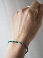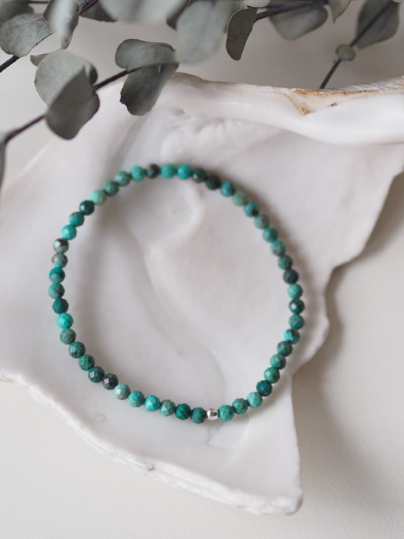 Jemný náramek z drobných broušených kuliček Tyrkysu svoji majitelku nejen rozzáří, ale také podpoří její dobrou náladu a mluvený projev. Tyrkys je ochranný kámen, jež má schopnost pomáhat při depresích a nízkých stavech psychiky. Přináší vnitřní radost a rovnováhu. Bývá nazýván Kamenem řečníků, protože harmonizuje 5. čakru, zmírňuje napětí a rozpouští stres. Dodává sílu před veřejným projevem. Posiluje intuici.
