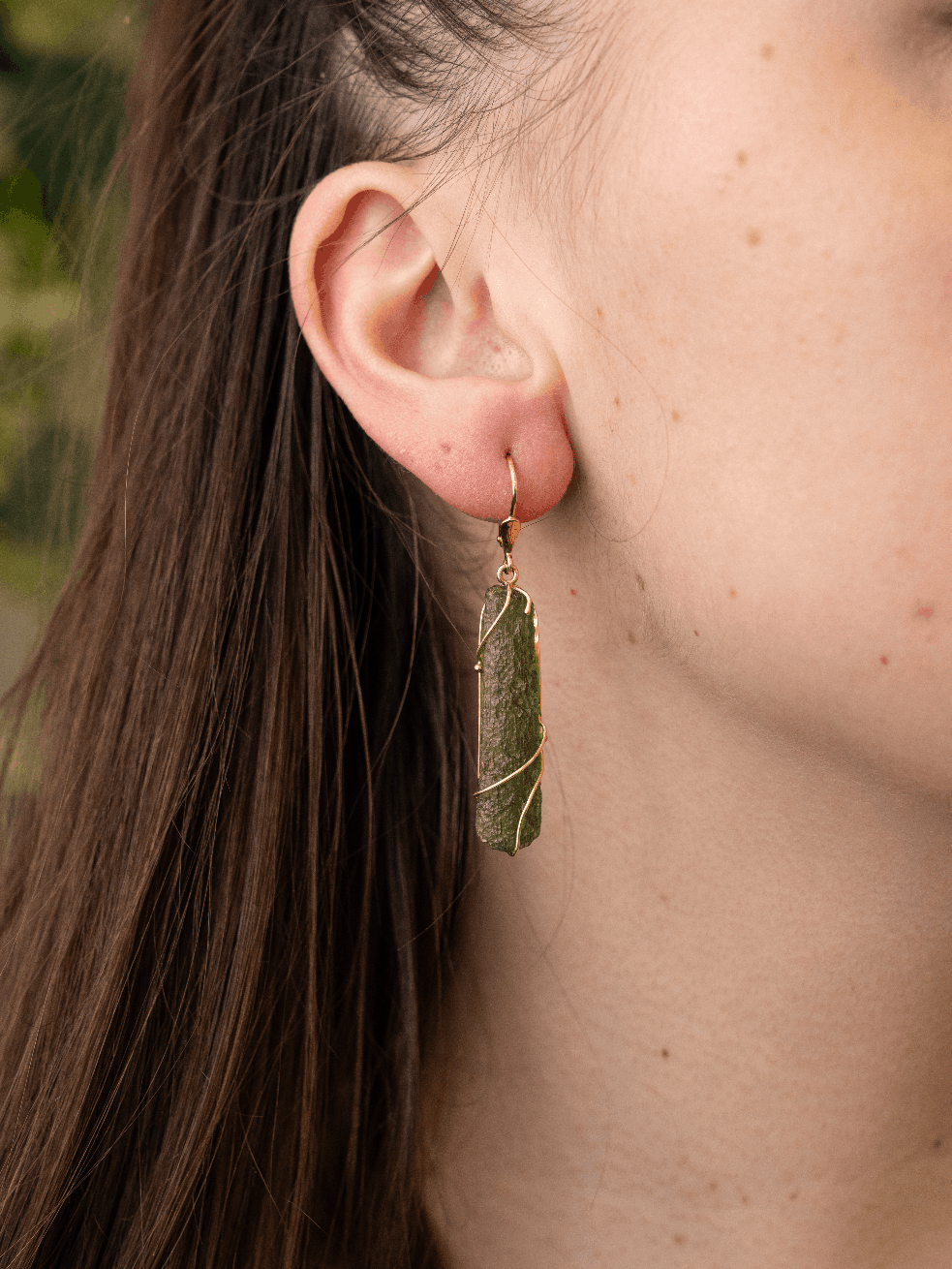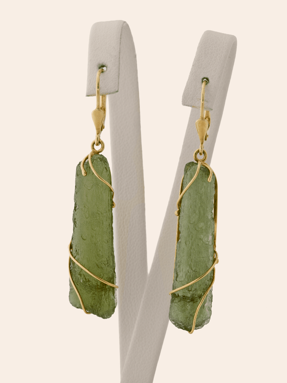 Precizně zpracované zlato Au 585/1000 českými šperkaři podtrhuje přirozenou krásu Vltavínu a nechává vyniknout jeho charakteristickou strukturu i jemné odstíny zelené.