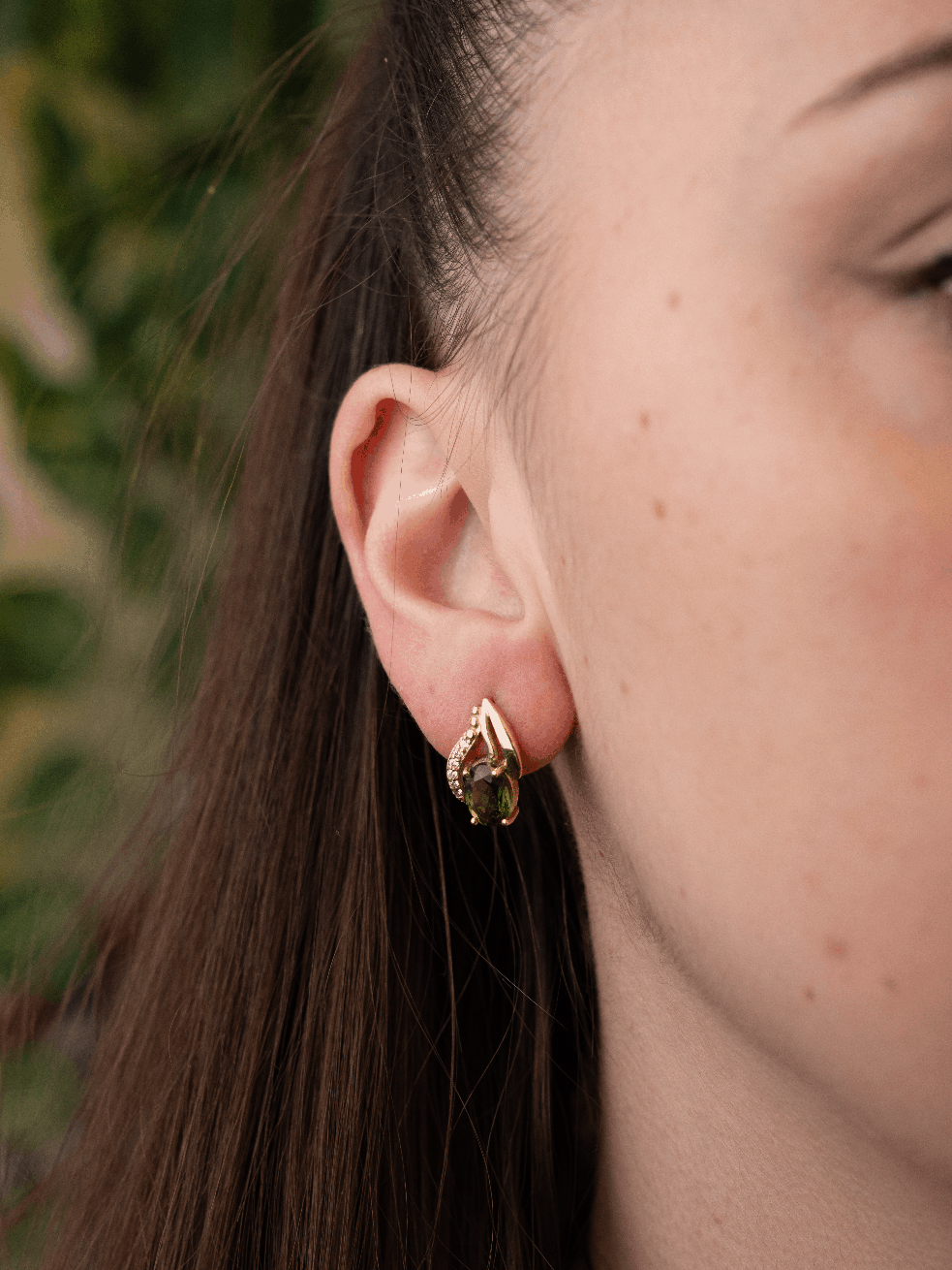 Precizně zpracované zlato Au 585/1000 českými šperkaři podtrhuje přirozenou krásu Vltavínu a nechává vyniknout jeho charakteristickou strukturu i jemné odstíny zelené.