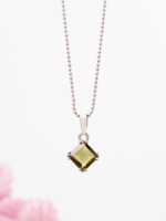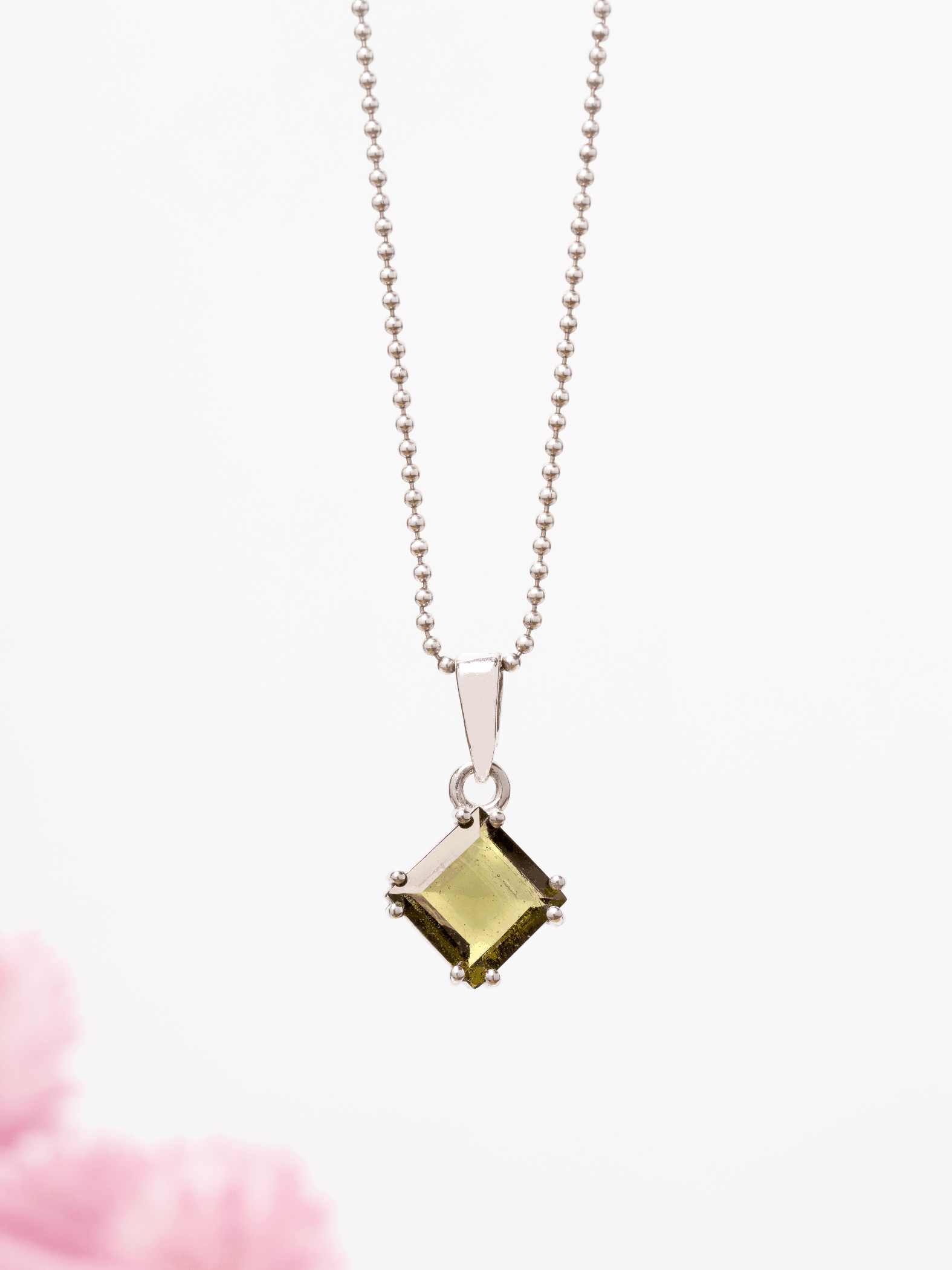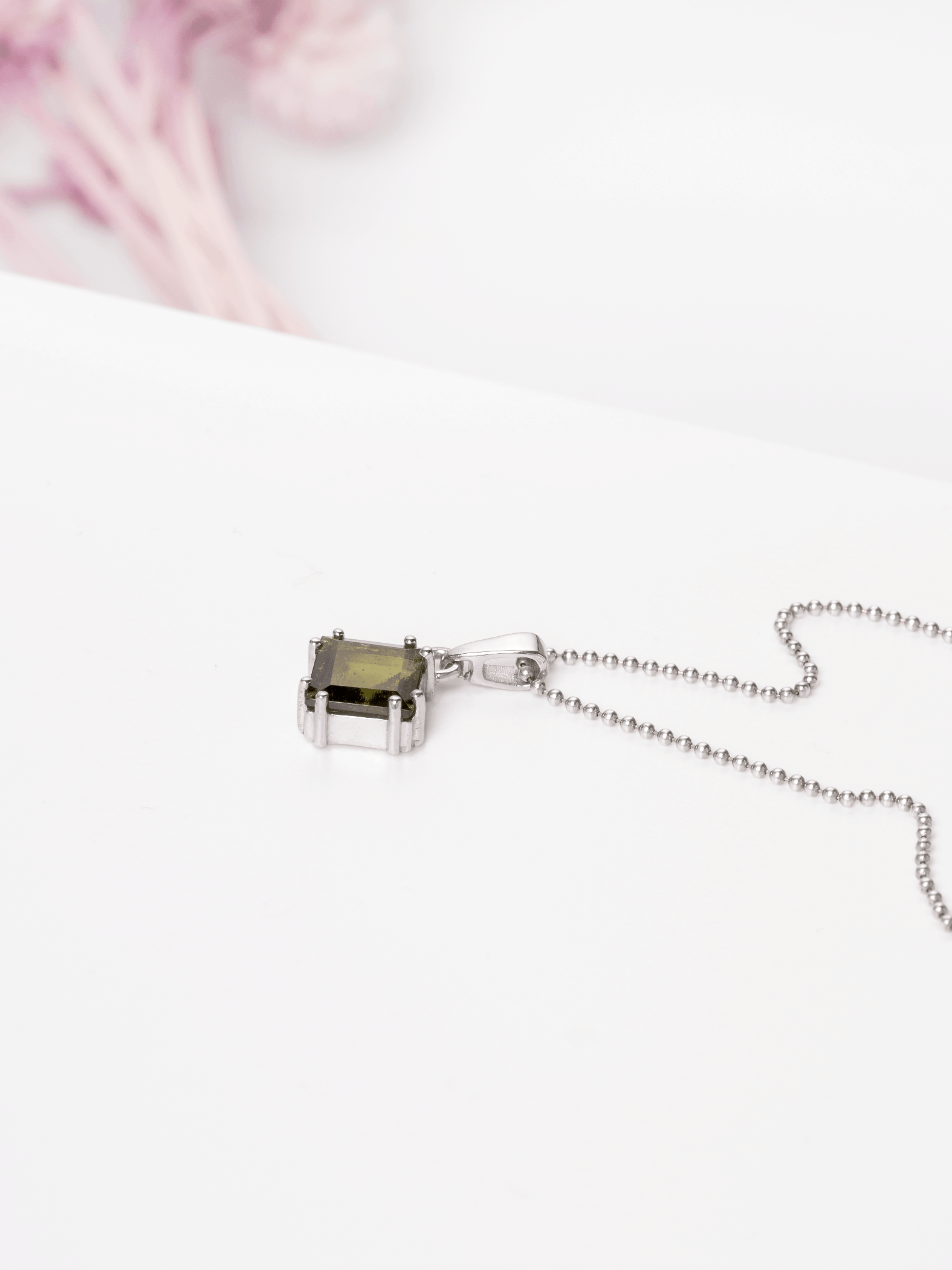 Precizně zpracované stříbro českými šperkaři podtrhuje přirozenou krásu Vltavínu a nechává vyniknout jeho charakteristickou strukturu i jemné odstíny zelené.