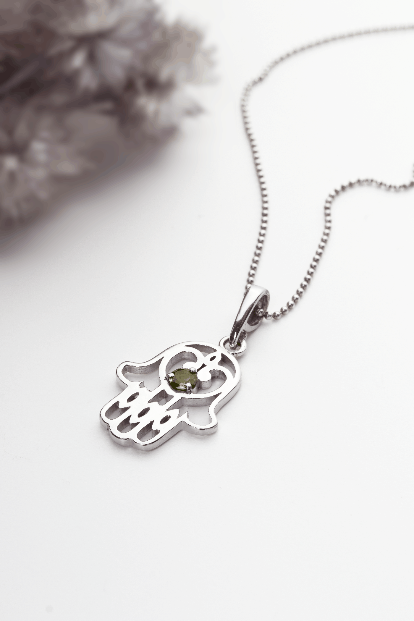 Precizně zpracované stříbro českými šperkaři podtrhuje přirozenou krásu Vltavínu a nechává vyniknout jeho charakteristickou strukturu i jemné odstíny zelené.