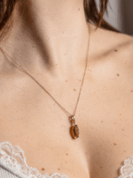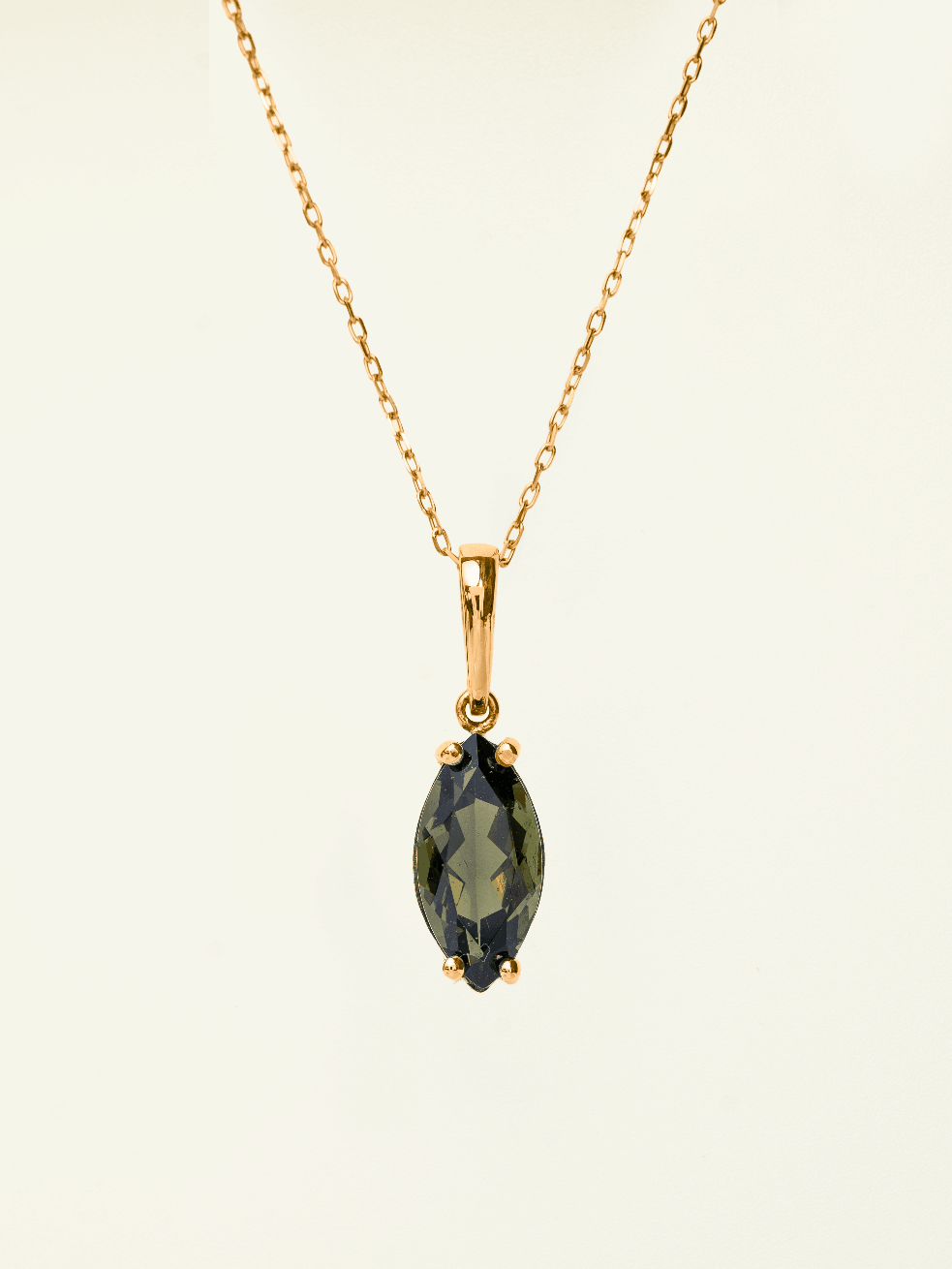 Precizně zpracované zlato Au 585/1000 českými šperkaři podtrhuje přirozenou krásu Vltavínu a nechává vyniknout jeho charakteristickou strukturu i jemné odstíny zelené.