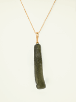 Precizně zpracované zlato Au 585/1000 českými šperkaři podtrhuje přirozenou krásu Vltavínu a nechává vyniknout jeho charakteristickou strukturu i jemné odstíny zelené.