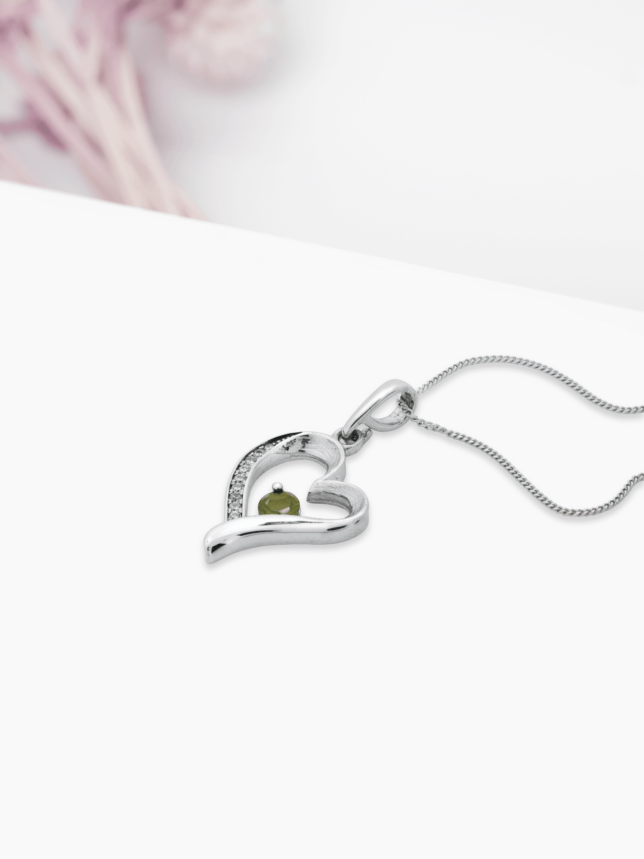 Stříbrný přívěsek ve tvaru srdíčka s českým Vltavínem a Zirkony. Vltavín podporuje jedinečnost svého majitele a odstraňuje vše, co jí brání. Osvětluje vše, co není Vaše. Pohne tím, na čem lpíte, abyste jasně viděli, co Vás brzdí. Povede Vás cestou Srdce, na které se potkáte s autenticitou a bezpodmínečností. Jedná se o kámen transformace, urychlení, přímosti, rozpadu iluzí.