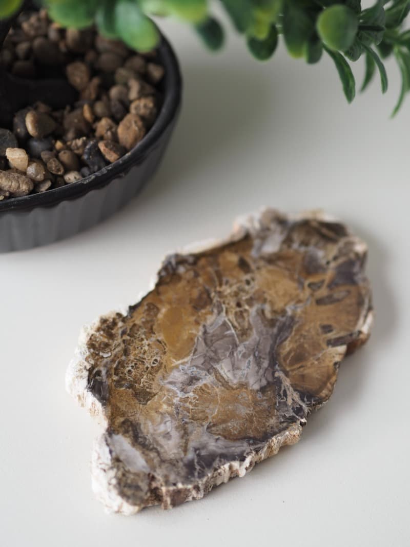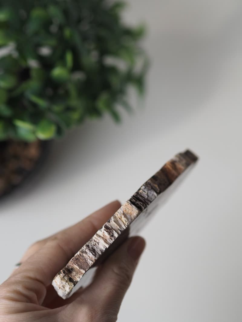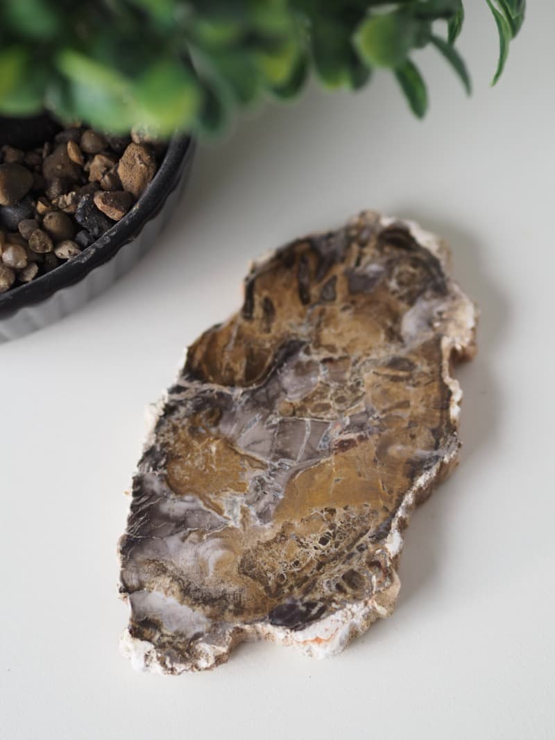 Plátek zkamenělého dřeva lze použít jako originální tácek, podložku na Vaše oblíbené šperky či vodu nebo jako dekoraci.